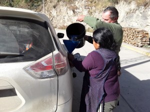 Torej sva se sama odpravila nazaj. V kraju Pucartambo sva iskala črpalko, pa je ni bilo. Ko sva povprašala pri domačinih, so kimali in nama kazali po cesti naprej. Ustaviva se pri branjevkah, ki so prodajale sadje in povprašava, kje bi lahko dobila bencin. Se je branjevka hitro obrnila, naju spremila do naslednje šupe, odprla vrata, iz sodov prelila bencin v vedro, vzela »trahtar« in vsebino vedra zlila v najin avtoček… A še pomnite, tovariši!?