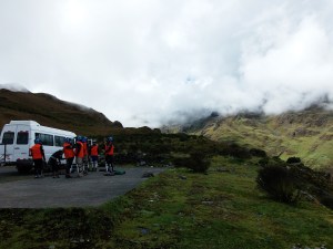 Celo malo prej kot je bilo dogovorjeno so naju že pobrali s turističnim kombijem pred hotelom. Presenečena sva bila nad pozdravom v slovenščini (eden od vodičev je tudi vodič za Shappo in se je naučil nekaj slovenskih besed). Na strehi avtomobila so bila pripravljena kolesa, kot dodatno ponudbo so nam obljubili kolesarski spust (downhill) s štiri tisoč na dva tisoč metrov. Iz Cusca smo se peljali proti severu in se ustavili v “Sveti dolini” na zajtrku. Po dolini vozi vlak, ki pripelje turiste pod Machu pichu. Zaradi visoke cene (komplet dvodnevna storitev preko 250 EUR na osebo) sva se odločila za alternativo z busom, kolesom in peš (150 EUR). Dolina se pozneje zoži, zato za cesto ni prostora. Cesta zavije preko prelaza Malga (dobrih 4.000 metrov visoko), malo pod prelazom je parkirišče, ki služi za kolesarsko izhodišče. Čelade, rokavice, ščitniki, svetleči jopiči…. tako opremljena še nisva nikoli kolesarila.