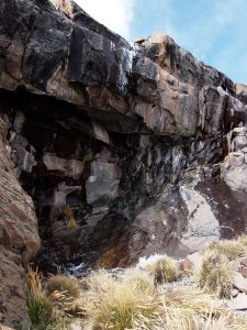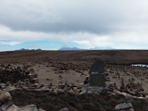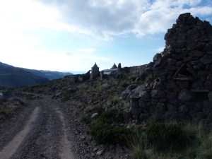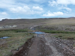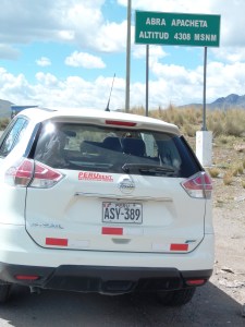 Torej sva izbrala priporočeno pot, ki se je lepo dvigala po dolinah. Njeno stanje je bilo bolj tako-tako. “Standard” teh cest (oz. kolovozov) je namreč prilagojen njihovim običajnim avtomobilom. Običajni avtomobil v peruanskih hribih pa je Toyota Hilux (tisti s kesonom). Midva sva imela sicer terenca, vendar je bil najin nissan vsaj 5 cm nižji od toyot, ki so jih uporabljali domačini. To je pomenilo, da sva marsikdaj nasedla, pri rečicah, ki so prečkale kolovoz, pa sva lahko le povsem počasi prebrodila strugo in lezla navzgor. Nekajkrat sva podrsala, vendar sva (presenetljivo) brez večjih problemov prispela do planote cca 4.600 metrov visoko, kjer naju je smerokaz usmeril proti najinemu cilji. Še malo naprej in pot se je končala. Avto sva parkirala ter se peš odpravila proti cilju, ki sva ga že videla v daljavi.