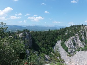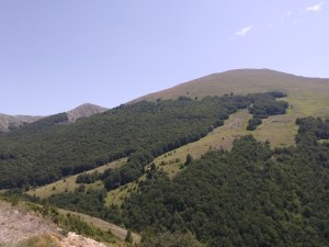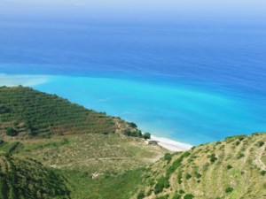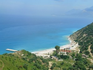Zopet proti severu. Najbolj južna točka je bila že za nama. Izbrala sva obalno cesto, ki velja za dokaj razgledno. Ni nama bilo žal. Obalna cesta se na najvišji točki dvigne preko 1.000 metrov visoko, z razgledišča na višini 900 metrov je zares čudoviti razgled na mesto Dhërmi in njegove smaragdne plaže. Na tej višini je bila okolica že povsem zelena, spuščali smo se v serpentinah po lepi dolini, ki je bila očitno zelo popularna, saj je bilo v njej precej planinskih koč in hotelov.