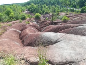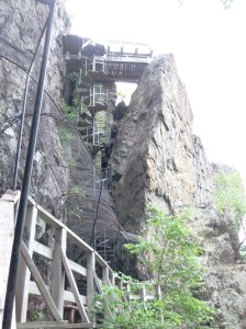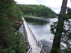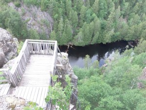 Tokrat bolj proti zahodu. Pred krajem Rouyn-Noranda sva ponovno zavila proti severu do parka d’Aigubelle. Park je velik, seveda za vse poti nisva imela časa, izbrala sva kotiček okoli pri jezeru Lac Sault, kjer je manjša vzpetina, s katere je lep razgled po parku. Spust nazaj do jezerskega obrežja poteka po umetno izdelanem kovinskem krožnem stopnišču. Prečkanje vode je urejeno z mostički, tako da v eni uri sprehoda naokrog vidiš kar nekaj zanimivosti.