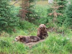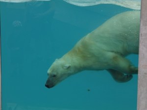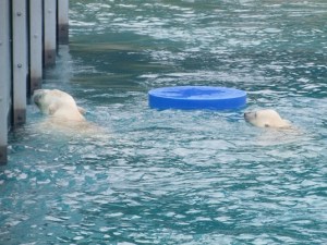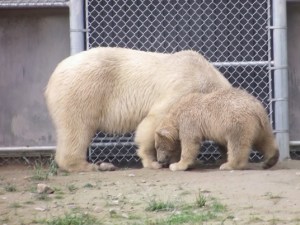 Tudi nekaj losov so imeli tam: bolje, da sva jih videla tako v parku, ne pa na cesti! V začetnem delu parka imajo tudi nekaj posebnih ograd, kjer so najbolj ponosni na dve beli polarni medvedki s svojima mladičema. Po njihovih trditvah noben ZOO na svetu ne premore dveh mladičev belega medveda. Para sta ločena, eden je v večji ogradi, ki je namenjena pohajkovanju, drugi pa v manjši ogradi z bazenom, kjer je medvedka nadvse uživala pri namakanju. Ker imajo zunanji rob bazena steklen, si lahko vsak ogleda njene vragolije.