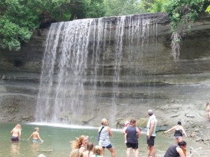 Pot sva nadaljevala do kraja Kagawong. Kratka rečica iz otoškega jezera Kagawong se preliva preko skale in ustvarja manjši slap, ki je precej obiskan. Ker je voda poleti dovolj topla, je tudi kopalcev veliko, najbolj pogumni pa se celo sprehodijo za slapom. Sprehodila sva se še ob rečici do njenega izliva v Huronsko jezero, tam pofirbcala na tržnici, če se najde kaj zanimivega in nadaljevala s krožno potjo okoli jezera Kagawong.