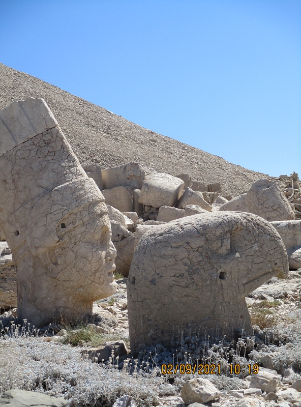 Kmalu zatem sva zavila v hribe proti gori Nemrut Dagi, ki je znana po svojih arheoloških ostankih (iz 1. st.po Kr.). Na vrhu tega hriba so kipi (oz. orjaške glave) nekdanjega vladarja Antioha in njegove družine. Ker je vladar prej umrl, teh kipov niso nikamor prenesli, kar ostali so tam in jih danes lahko gledamo tudi kot svojevrstne nagrobne spomenike. Dandanes velja to za eno najbolj mondenih arheoloških najdbišč v tem delu Turčije. Doprsni kipi so visoki nad dva metra, očitno so vili vklesani v kvalitetno skalo, saj so oblike še dandanes povsem realne in razpoznavne. K temu je verjetno malo pripomoglo tudi suho podnebje na tem koncu.
