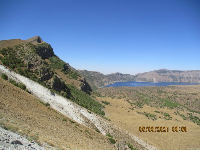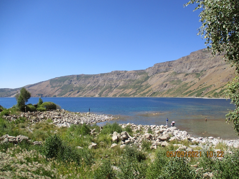 To jezero je bilo tudi eden poglavitnih razlogov, da sva se odločila za njegov ogled: jezera v vulkansko kotanji pač doslej še nisva videla. Pot navzdol v kotanjo je bila ponekod dokaj slaba, vendar sva jo tudi midva z najinim običajnim pežojčkom zmogla. Tudi na koncu sva ugotavljala, da za ta del Turčije ne rabiš terenca (razen, če se odpravljaš stran od glavnih cest). Parkirala sva v bližini jezera in se odpravila do njegovega roba. Je bilo že kar živahno. Ker je bila nedelja, je bilo že kar nekaj ljudi tam okoli, seveda so se ob jezeru zadržali precej dlje kot midva, S sabo so imeli žar, meso, pijačo… tam so načrtovali nedeljski družinski piknik.
