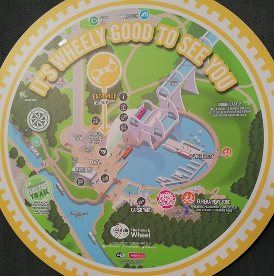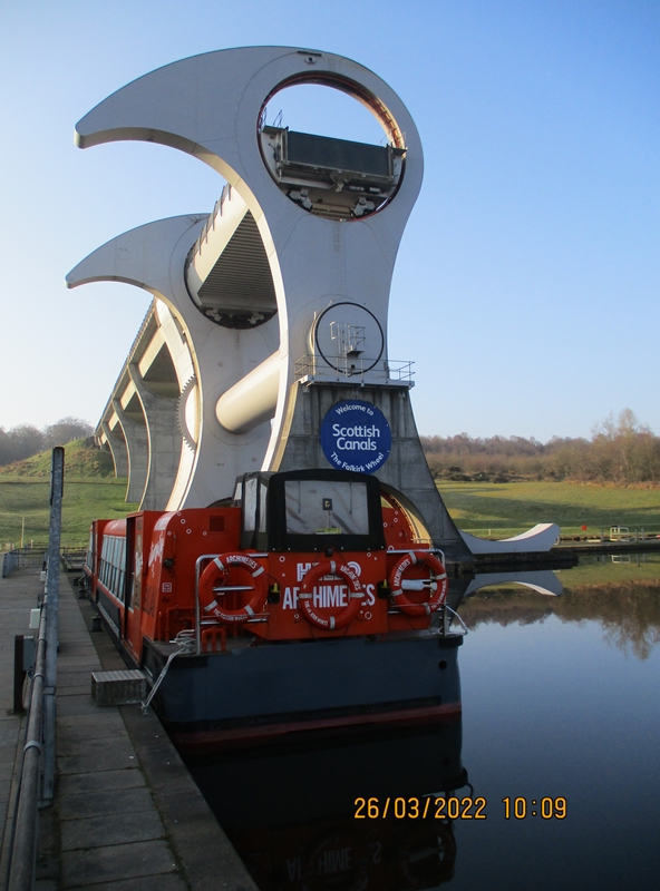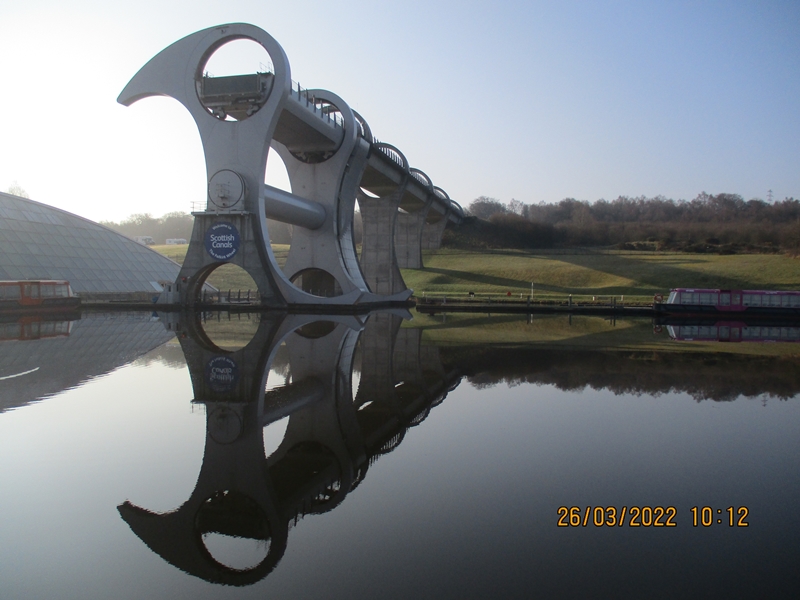 Pot naju je peljala najprej malo proti jugu, do kraja Falkirk, kjer je ena bolj znanih tehničnih znamenitosti tistih krajev. Gre za velikansko kolo (edino takšne vrste na svetu), ki dvigne ladjo na višji nivo (oz. spusti na nižji nivo) z višinsko razliko 24 metrov. Ladja je seveda omejena glede na velikost bazena, ki je pričvrščen na kolo. Ko ladja zapelje v bazen, se kolo zavrti skupaj z ladjo v bazenu. Kot protiutež je seveda bazen na drugi strani, lahko je le napolnjen z vodo, lahko pa je tudi v tistem bazenu kakšna ladja ali čoln.