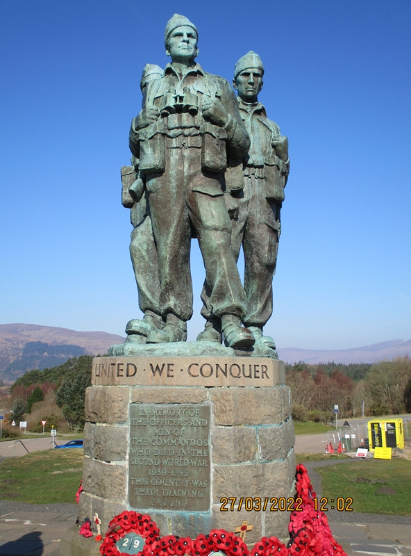 Nadaljevala sva pot proti Fort Williamu. Spotoma sva se ustavila še pri spomeniku junakom iz druge svetovne vojne, ki so ga postavili na res lepem kraju, sredi malo širše doline. Od tukaj se je že videl Ben Nevis, najvišji škotski hrib.