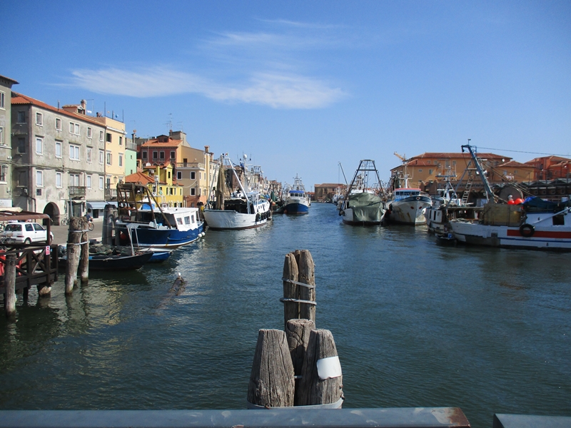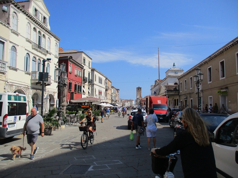 Čez most sva lahko takoj zavila na lokalno cesto (večinoma je bila tudi kolesarska steza, ločena od vozišča) skozi predmestje Brondolo in naprej proti centru mesta Chioggia. zavila sva še proti obali, ki je bogato poseljena s hoteli. Kraj je imel živahen turistični utrip, so pa seveda tam plaže bolj enolične. Dolge peščene plaže so precej “temne” zaradi sive mivke na njih. Kadar piha, valovi dvigujejo to mivko in morje zgleda precej umazano.