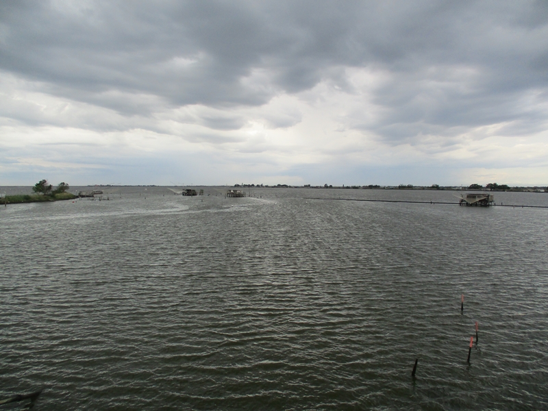 Na jugozahodni strani je bilo precej črno, ponekod je bilo videti, da že dežuje. Zaradi tega sva načrt spremenila in se po nasipih med lagunami vrnila nazaj proti obali v Lido degli Estensi. Skozi mestece do kanala, ki sva ga prečkala z ladjico (v eno smer 80 centov za osebo s kolesom) do Porto Garibaldi. Nato sva zopet sledila obali in se vrnila do prenočišča.